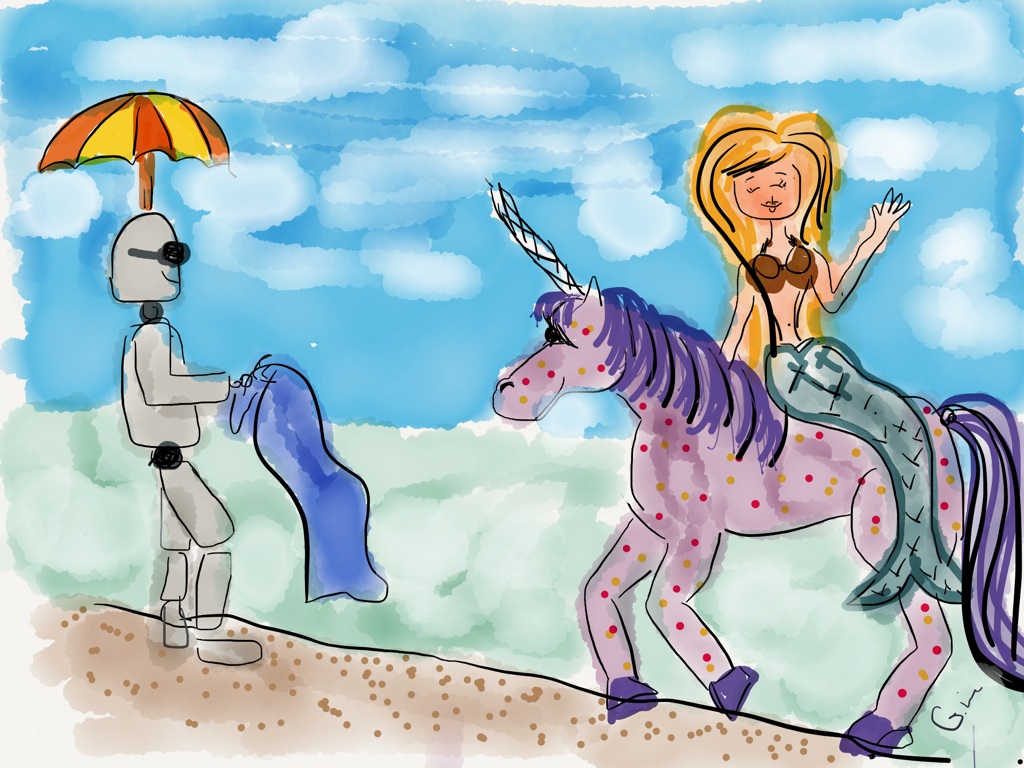 (Mermaid, Robot, Unicorn picture drawn by me. Time machine picture drawn by the talented Schrecklet…Bailey Schreck using Paper app by 53.)